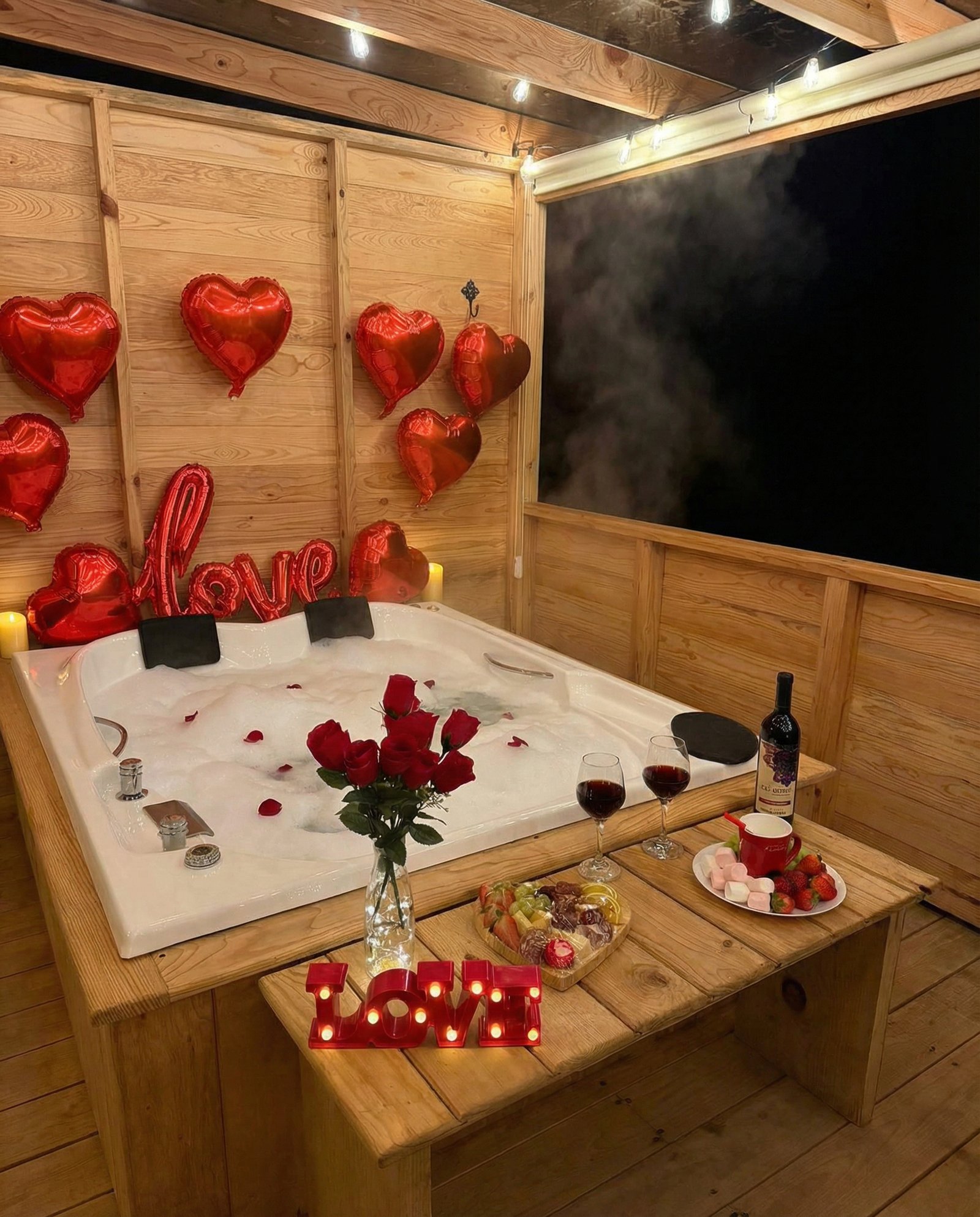 Eleva tu experiencia con nuestra tabla de carnes frías y quesos, acompañada de vino, fruta fresca como uvas y bombones para derretir y compartir un momento acogedor y romántico.